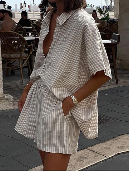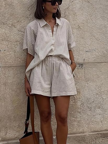 材质:棉、涤两件套女式休闲服装。柔软,透气,穿着舒适 特点:今年夏天女性的两件套装包括条纹衬衫,翻领v领,宽松的尺码,搭配有口袋的短裤,系上鞋带,松紧带增加穿着舒适度 款式:女式条纹衬衫套装2件套,夏季两件套套装,基本款和波西米亚休闲风格,可搭配或与其他单品分开穿。它也可以作为日常睡衣使用 场合:这一套提供了不同场合的多功能性。无论你是在享受悠闲的一天还是跑腿,这套套装都能让你看起来毫不费力地时髦,同时保持一整天的舒适。适合居家、休闲、外出、上学、约会、度假、沙滩等场合使用 场合:这款短裤可以轻松地在休闲和正式场合之间转换,非常适合外出,旅行度假,办公室,街道,约会,购物,俱乐部,聚会,返校等等