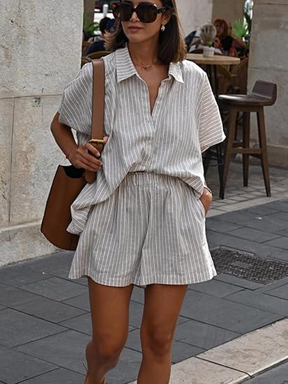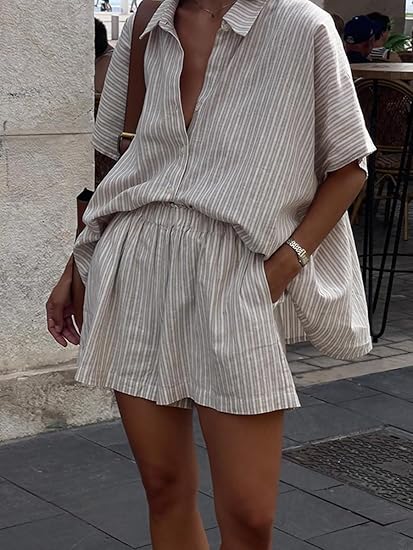 Womens 2 Piece Outfits Striped Short Sleeve Oversized Button Down Collared Shirt Wide Leg Shorts Sets