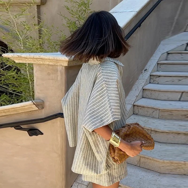 女子2件套条纹短袖超大纽扣领衬衫宽腿短裤套装