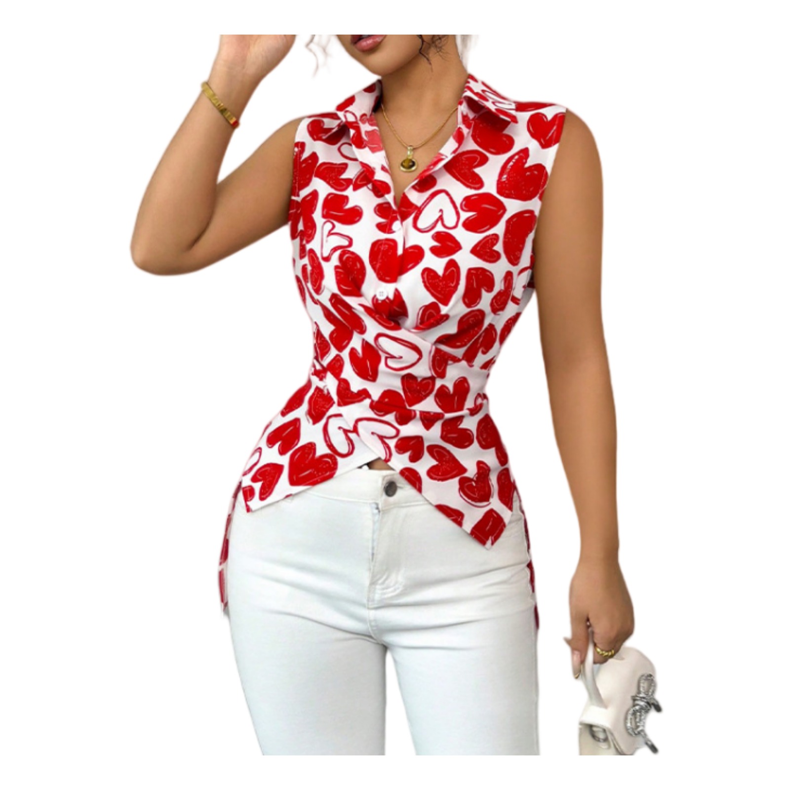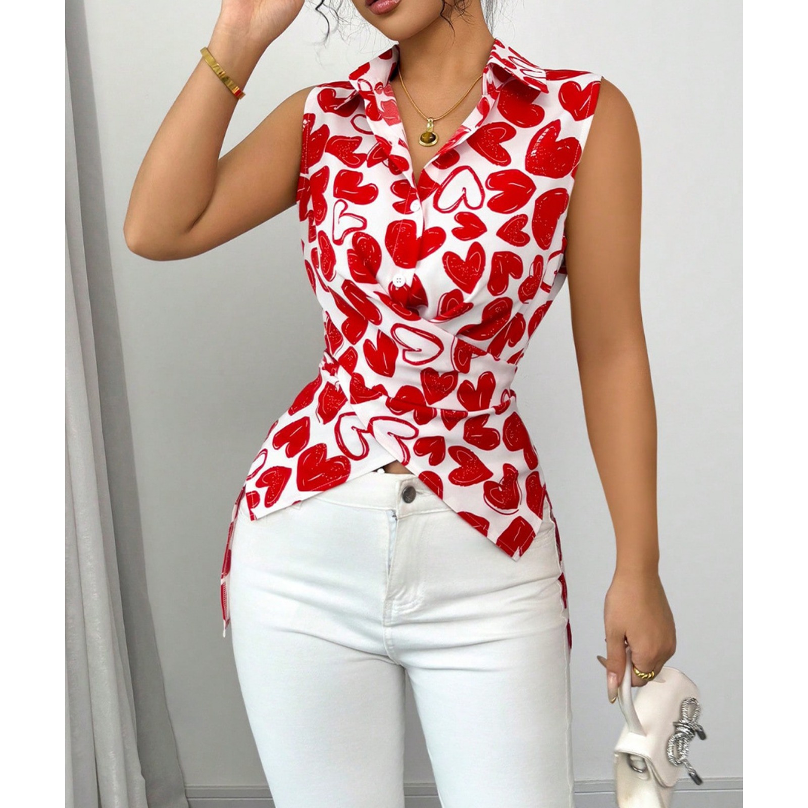 Women's Sleeveless Vacation Style V-Neck Button-Down Shirt with Tie Waist, Split Hem & Heart Print - Casual Notched Collar Blouse