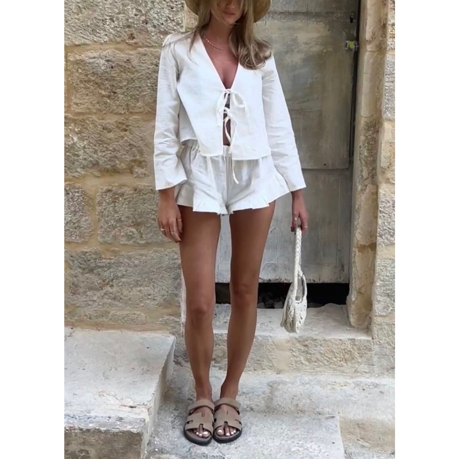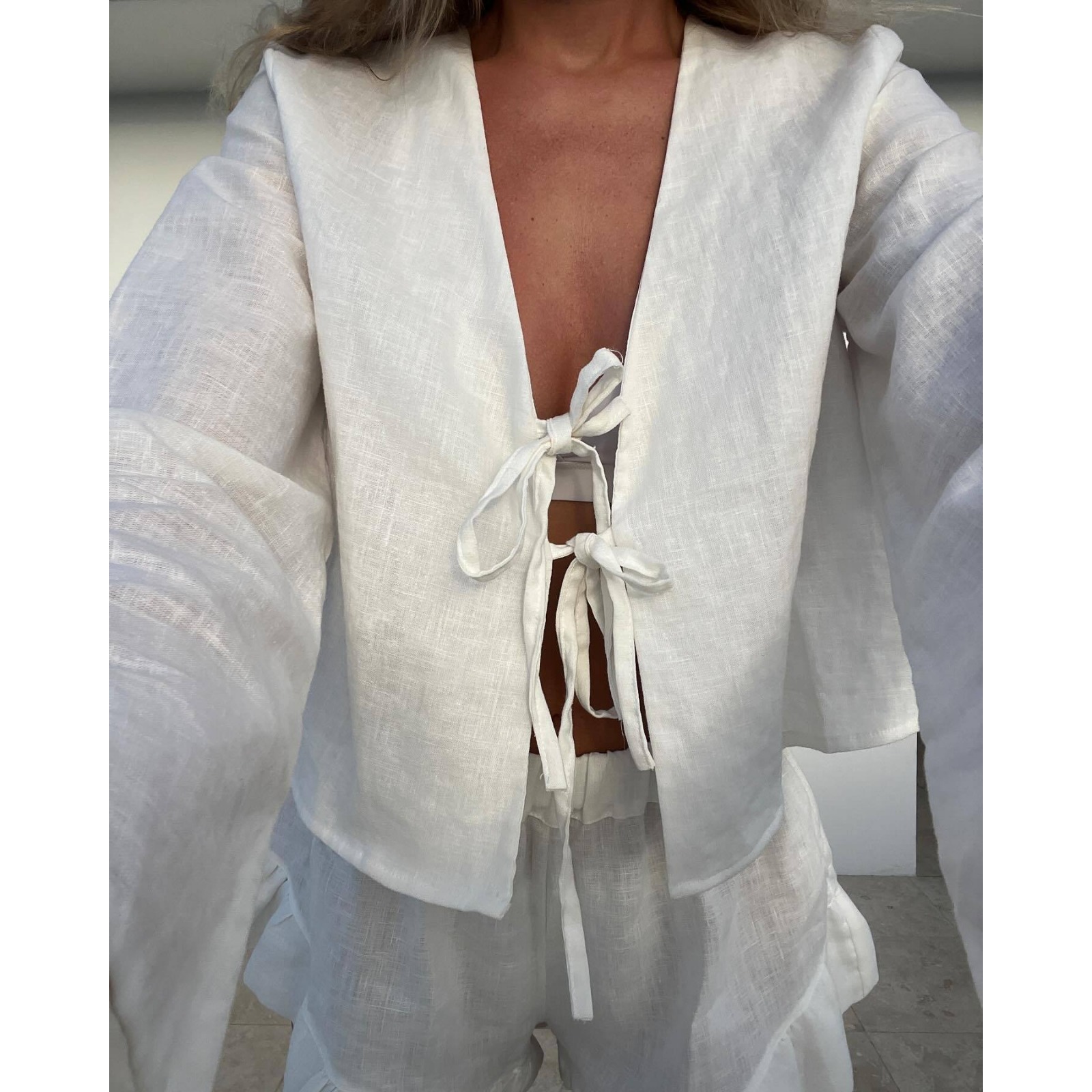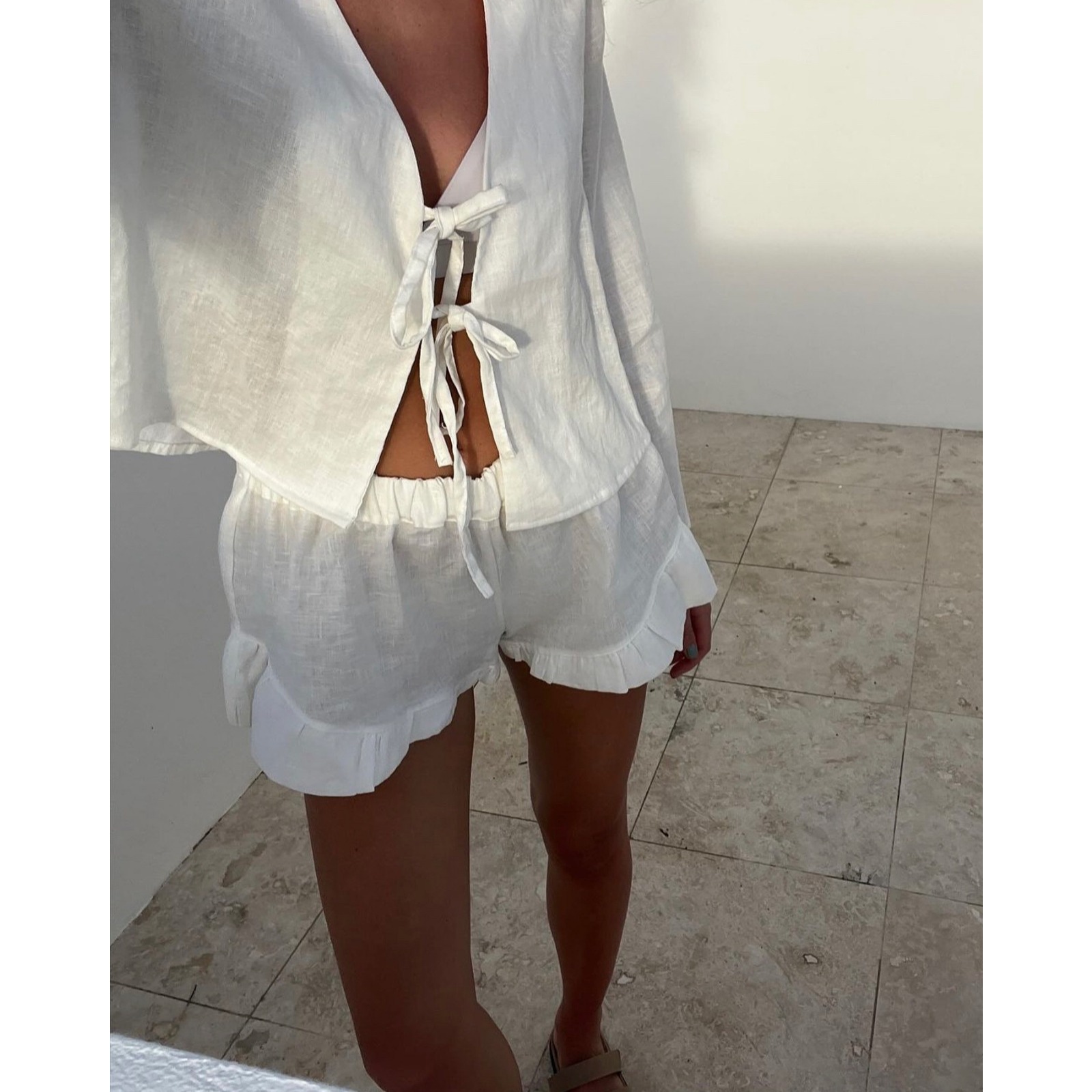 Women's Cotton V-Neck Tie-Front Lounge-to-Office Shorts Set White Ruffled Hem Casual Sleeve Top & Skort Outfit with Bow Detail