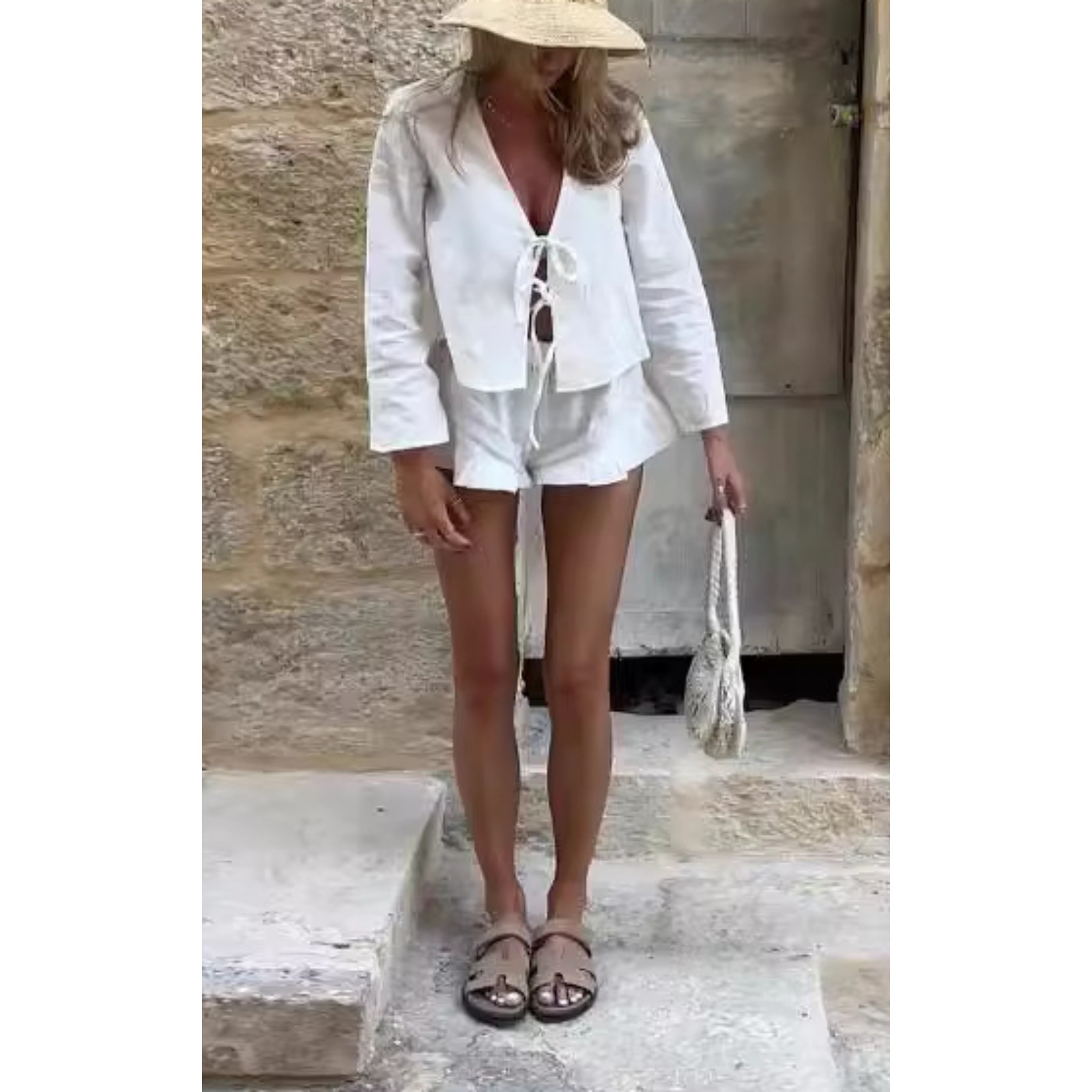 时尚女套装纯棉系带宽松休闲通勤短裤套装女