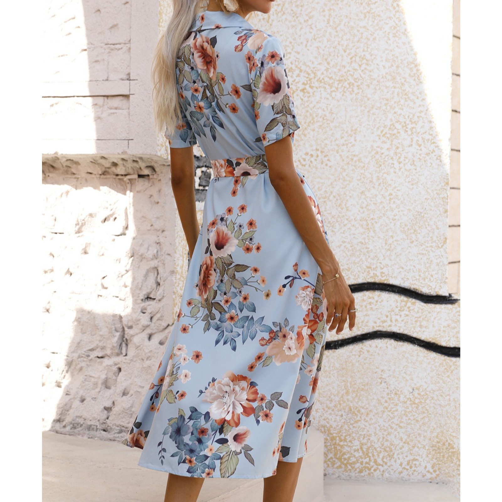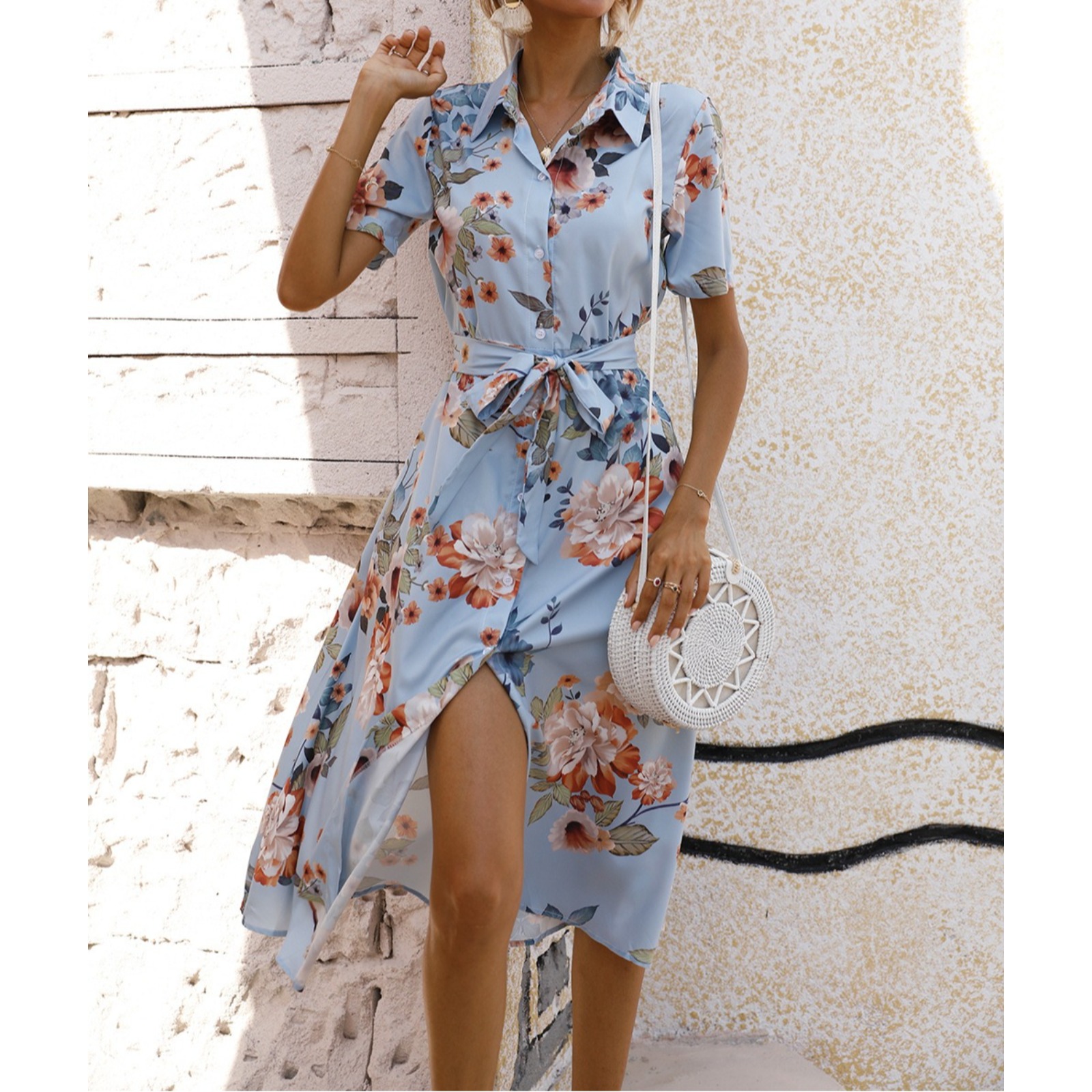 Women's Button Front Shirt Dress Short Sleeve Floral Print Tie Waist Asymmetrical Hem Side Slit Casual Summer Vacation Sundress