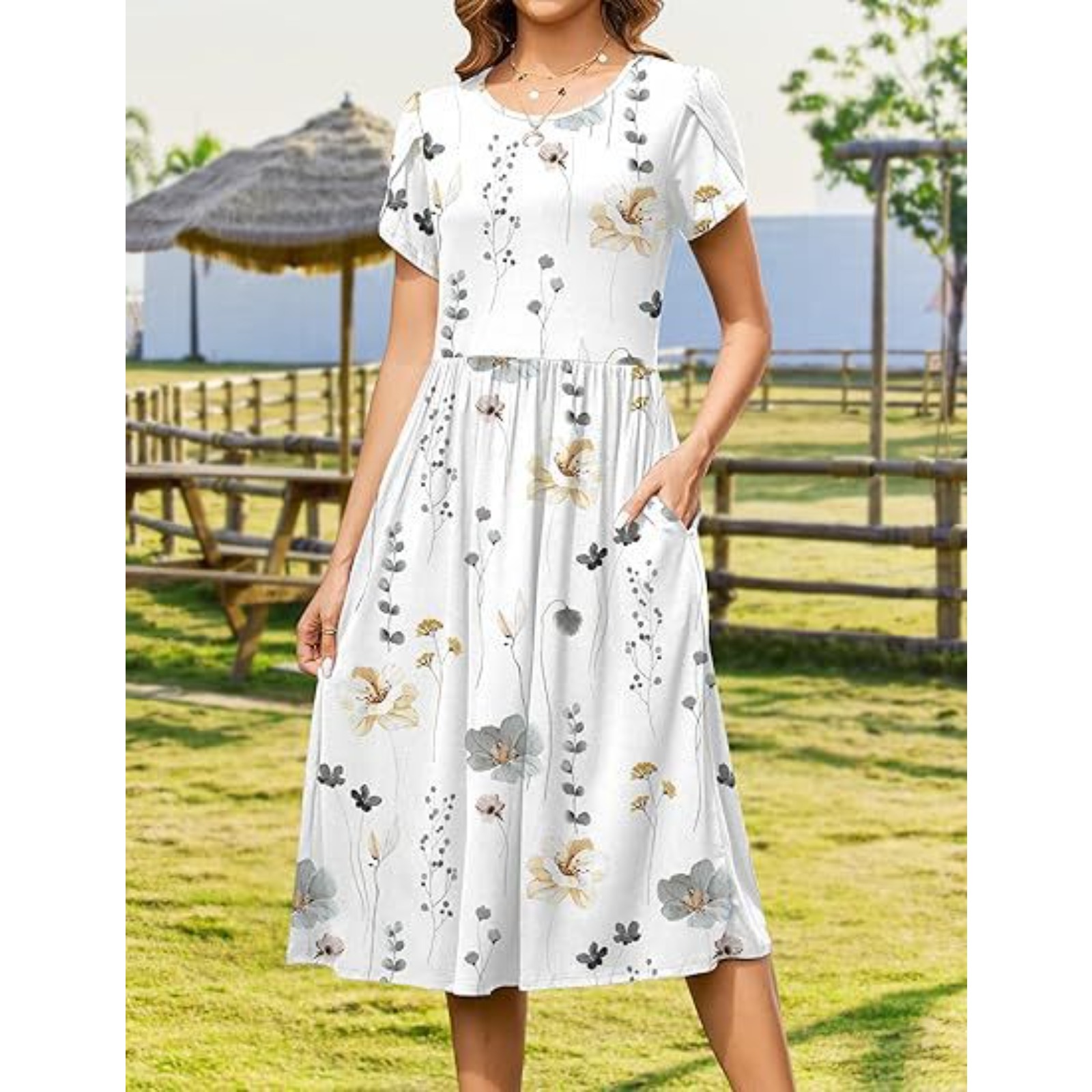 Women's Round Neck Floral Print Midi Dress Ruffle Trim Short Sleeve Loose Shift Silhouette Vacation Ready