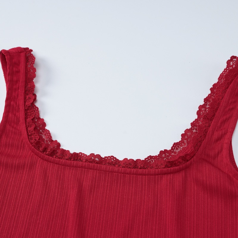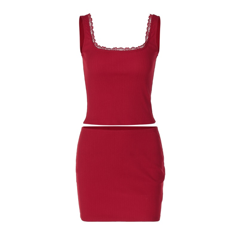 女装蕾丝花边吊带方领辣妹上衣纯色包臀短裙套装