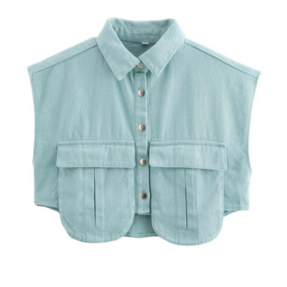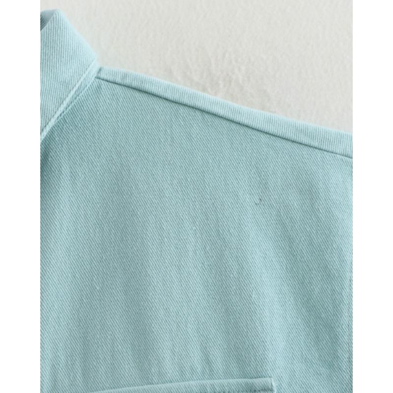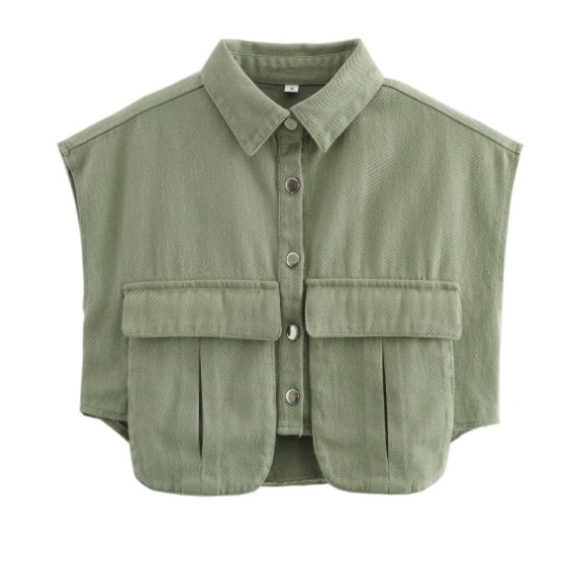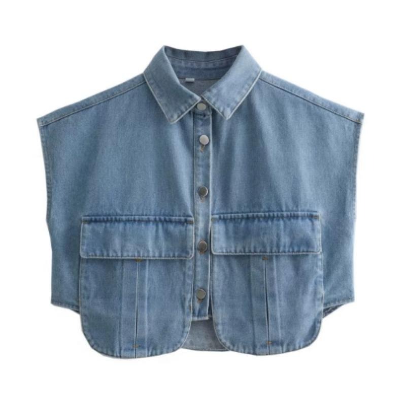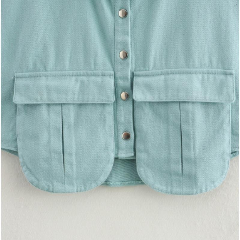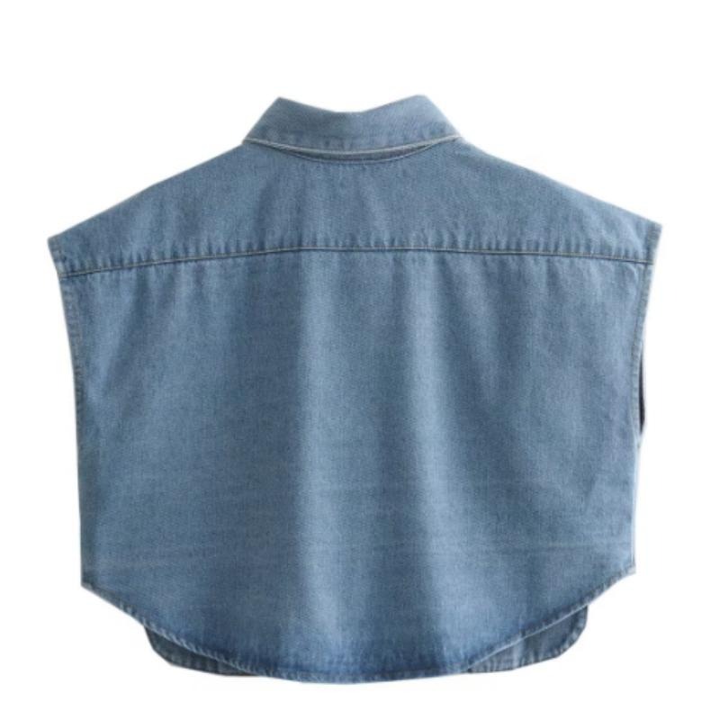 女装2025纽扣衬衫可爱袖子露脐上衣衬衫,纯色大口袋无袖马球领牛仔衬衫春夏
