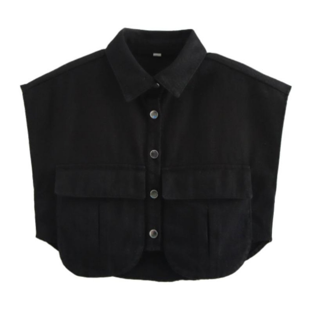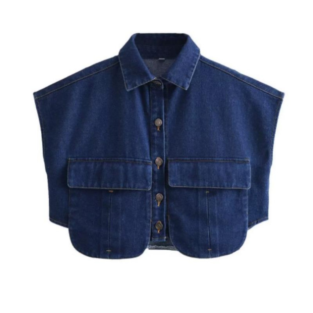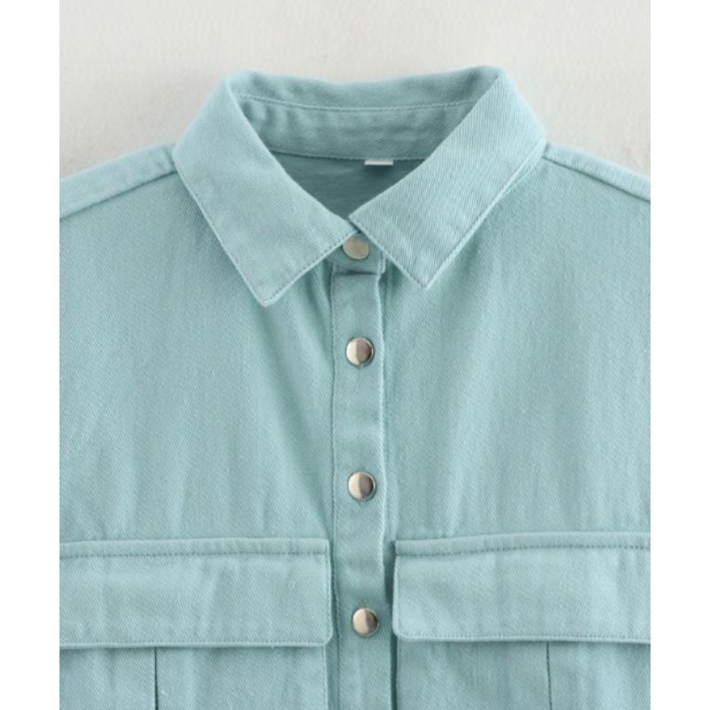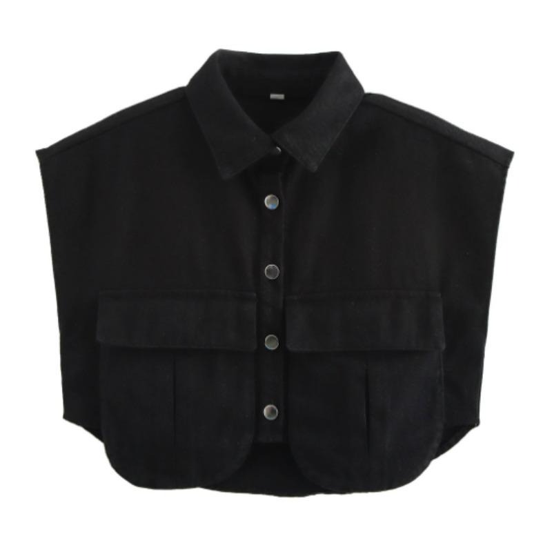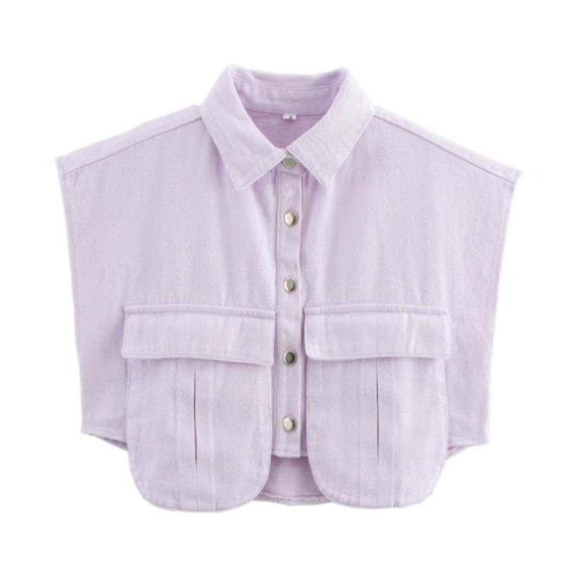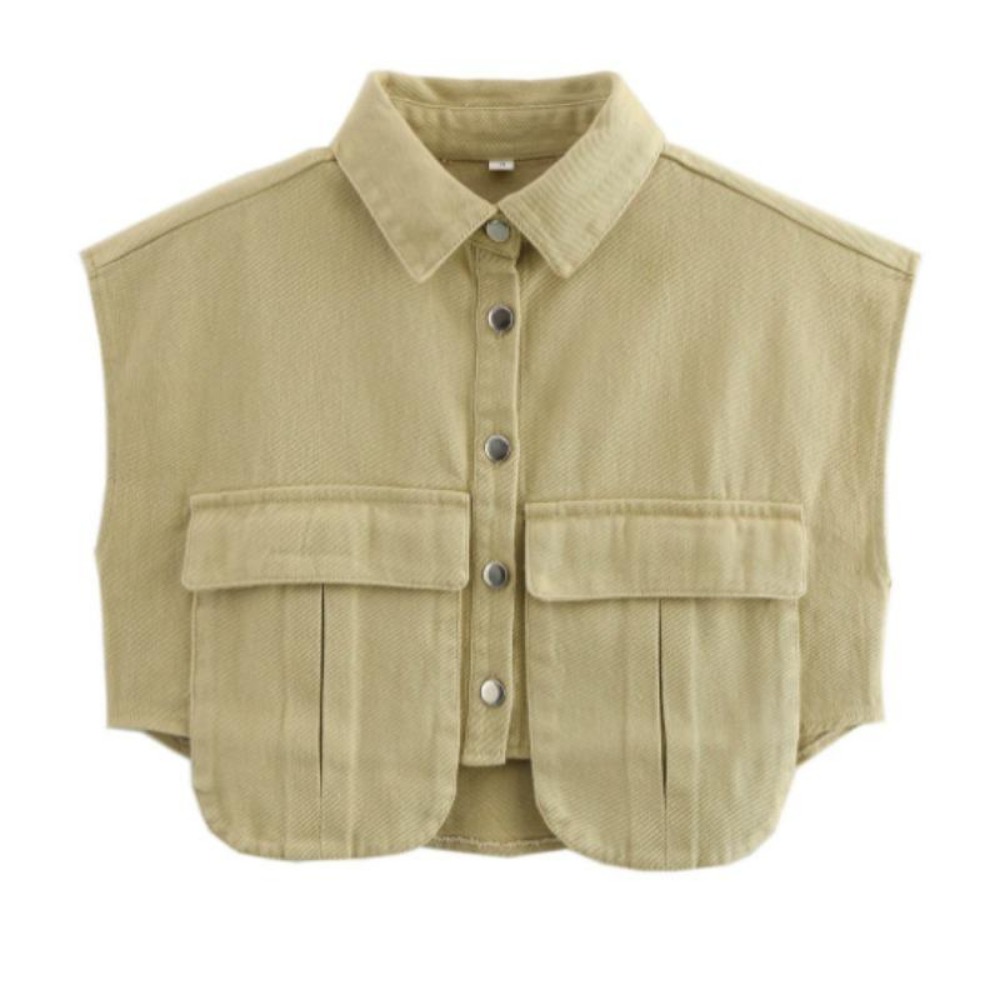 女装2025纽扣衬衫可爱袖子露脐上衣衬衫,纯色大口袋无袖马球领牛仔衬衫春夏