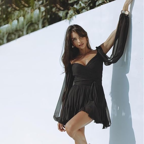 Beach Mini Dress is fashionable and beautiful makes you look extraordinarily sexy and very feminine. Classic A-Line and elastic high waist design shows the body curve very well. Above knee length makes your legs look longer, simple but elegant. Feature: Long Sleeve, Elastic Cuffs, Adjustable Tie Waist, Cross V-neck design detailing make you more attractive, the flowy tiered ruffle hem swing freely at your pace, can hide tummy pretty well, solid color simple and advanced make this chic dress really stand out! Beach Essential: Whether you're soaking up the sun on a beach or strolling along the boardwalk, pairing this bikini coverup with a sun hat and some jewelry can effortlessly create a chic seaside look. Customer satisfaction service: This is our flagship product, made from 100% high-quality chiffon material, ensuring a premium feel and durability. I am confident that you will not be disappointed after making the purchase. We take pride in our commitment to quality and provide professional customer service before and after your purchase. If there is any quality issue with the dress, please feel free to contact us. We are here to ensure your complete satisfaction with our product.
