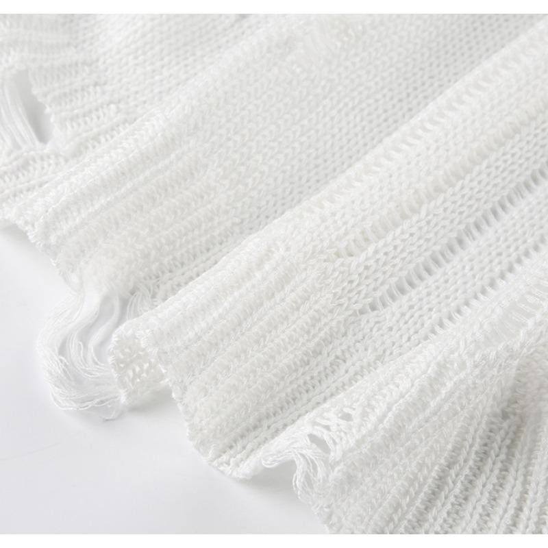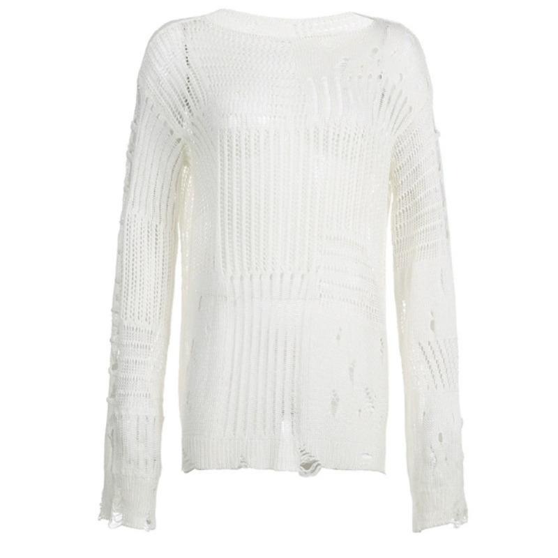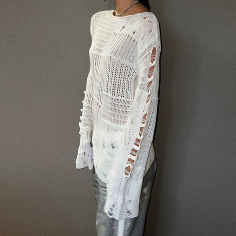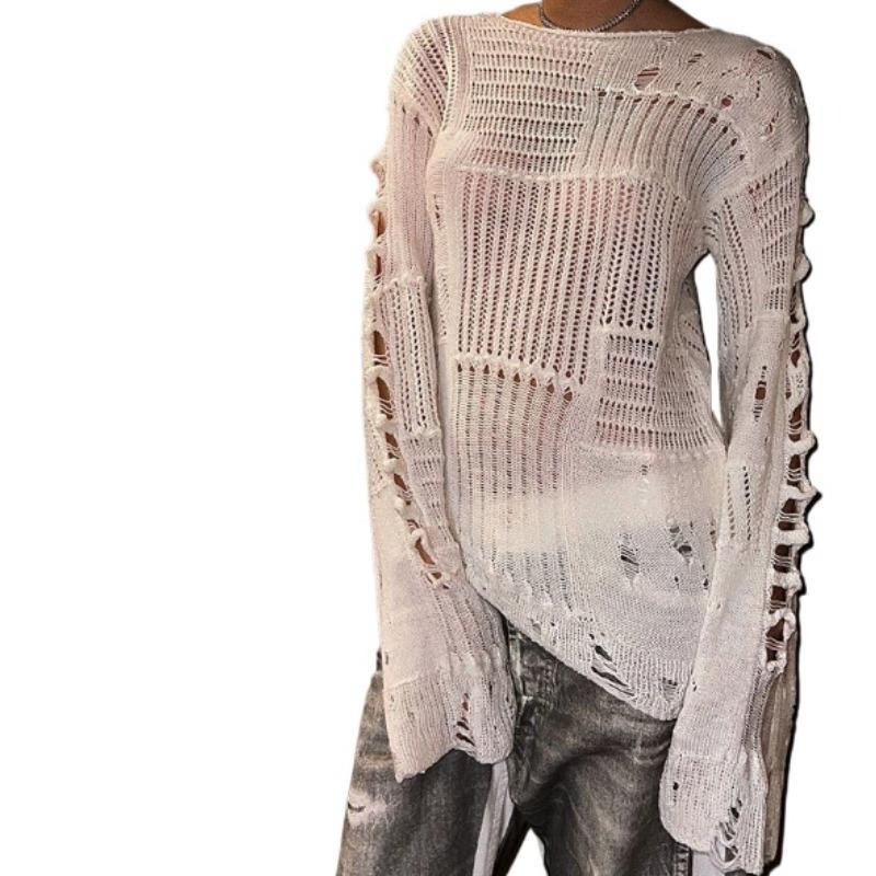时尚破烂感镂空上衣早春新款小众设计慵懒感长袖毛织长款罩衫
