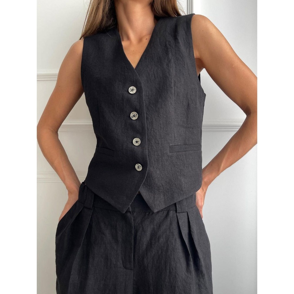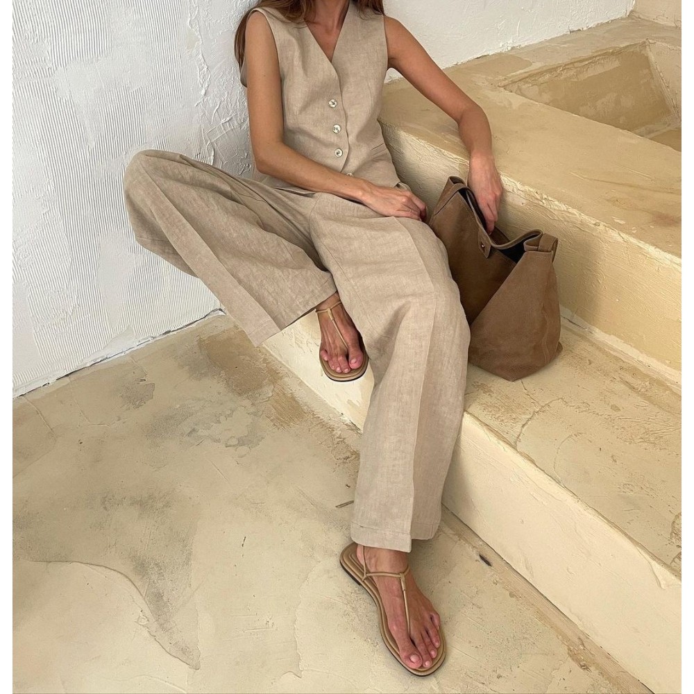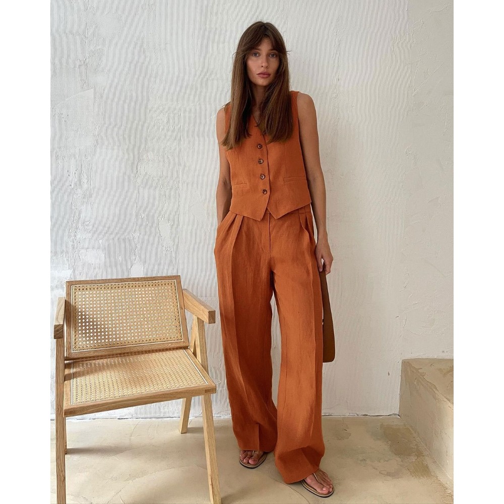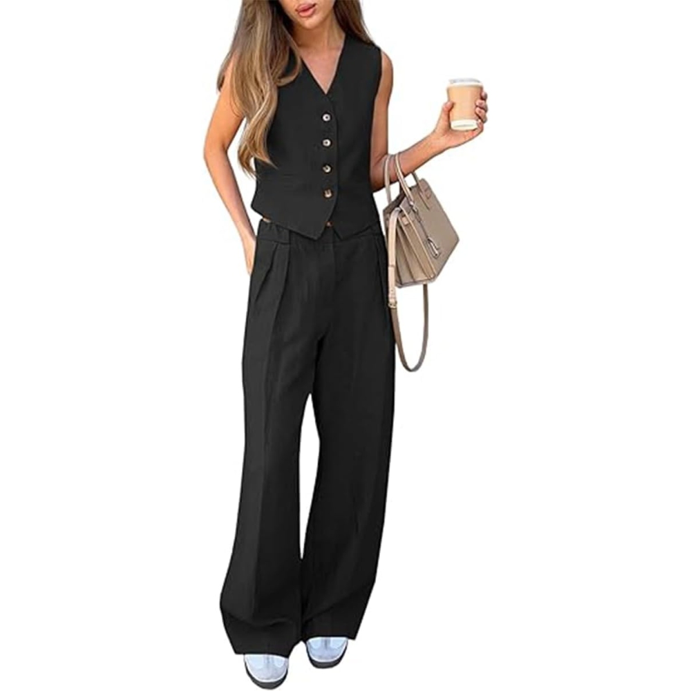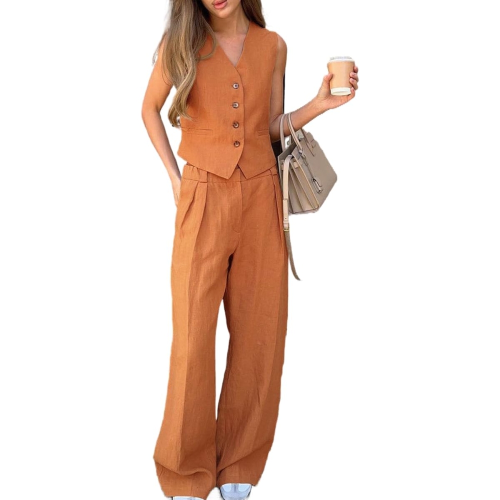 【棉麻材质】这款两件套西装背心由优质棉麻混纺制成,透气性极佳,质地自然,非常适合温暖的季节。轻盈面料让你保持凉爽、舒适和亲肤,打造轻松优雅的外观 【设计特点】V领设计凸显迷人曲线,拉长颈部曲线,无袖设计易于折叠。背心前部的纽扣上衣打造出结构化和定制的轮廓,使身体更加对称,增添了一丝精致。宽松的阔腿裤搭配低腰剪裁,营造出休闲氛围,流畅的轮廓平衡了舒适性和时尚性,提供了运动自由。将简单线条与中性色调融为一体,体现低调优雅